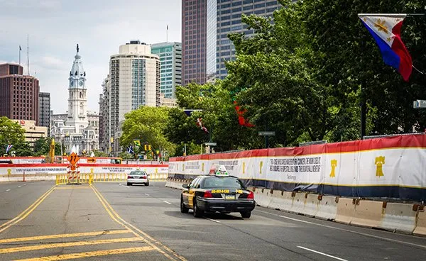 Well, the Democratic National Convention is currently being held right here in Philadelphia, Pennsylvania! Color Reflections was asked to print and install the banners that you see in the following photos. These banners are lined up quite prominently along the Benjamin Franklin Parkway. You can see City Hall and the Art Museum in the background!