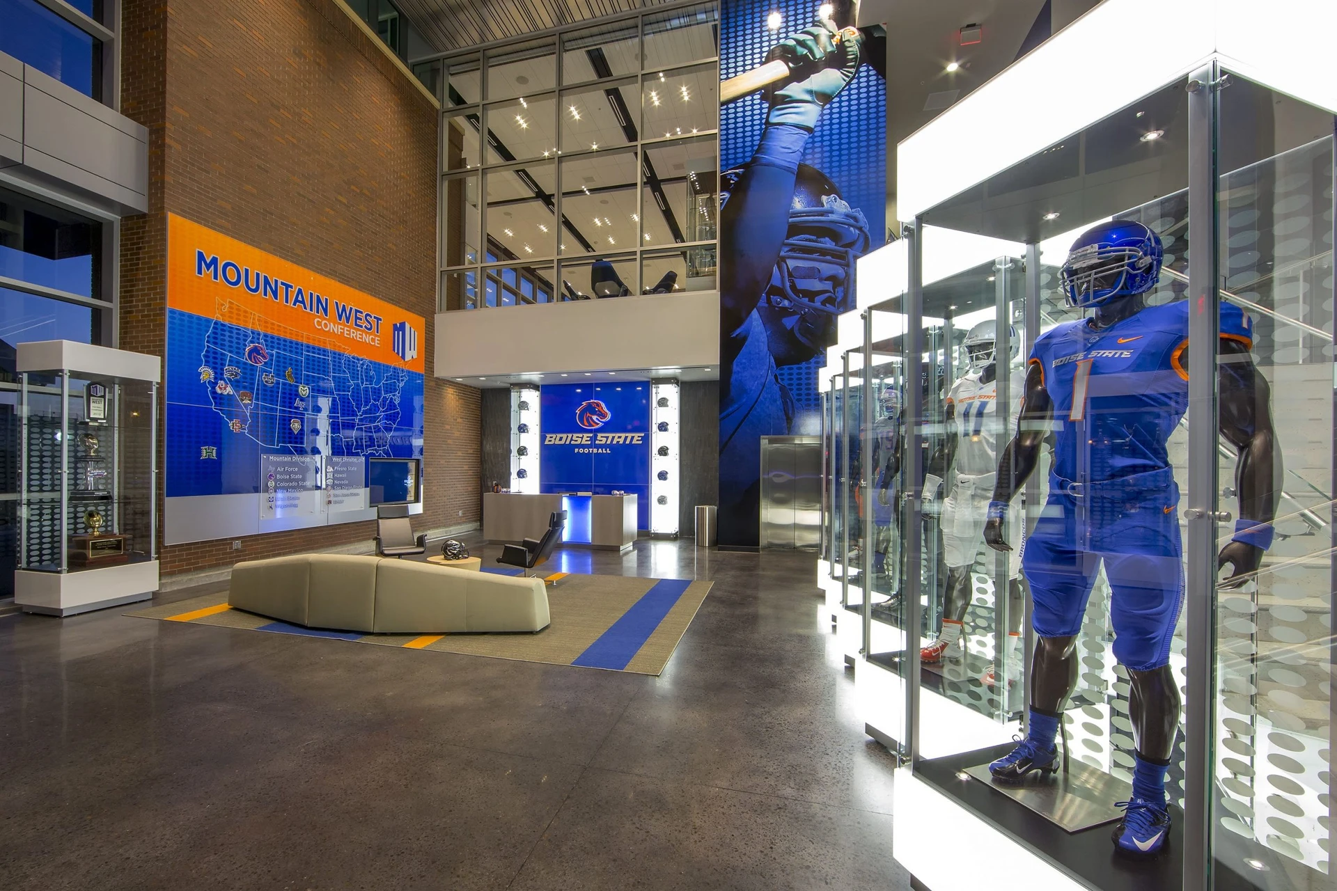 Idaho is obviously well known for its potatoes but is becoming increasingly famous for housing one of the most successful college football teams, Boise State. The Broncos have taken the world by storm over the past few years by climbing up the ranks in the BCS Standings. The Boise State football facility needed to reflect the top-level performance that their team gives on the field so they gave Color Reflections a call. The facility ended up looking like this. We think that there are some professional teams out there that are jealous! Great job designers and installers!